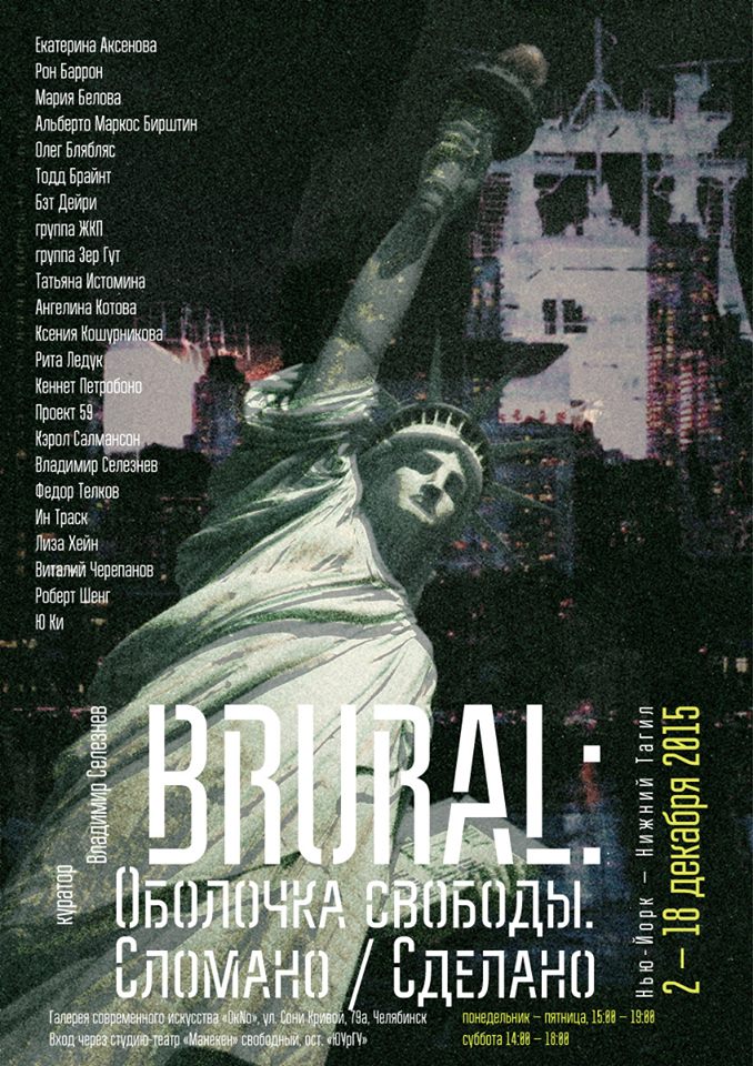 BRURAL: Skin of Liberty, Fractured and re-Structured brings together artists of different creative strategies, styles and media, who make aesthetic experiments with the environment and postindustrial contemporary reality. They use ready-made industrial and postindustrial culture; new media space and modern social contexts; recycling of urban space and architecture, garbage, newspapers and magazines; ruins and remnants of things and ideas. Often with guerrilla methods, artists change the very essence of phenomena and objects, modifying their structure and developing new meanings. The exhibition features works in the genre of video, photos, collages, mixed media and installations.